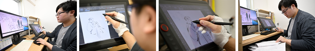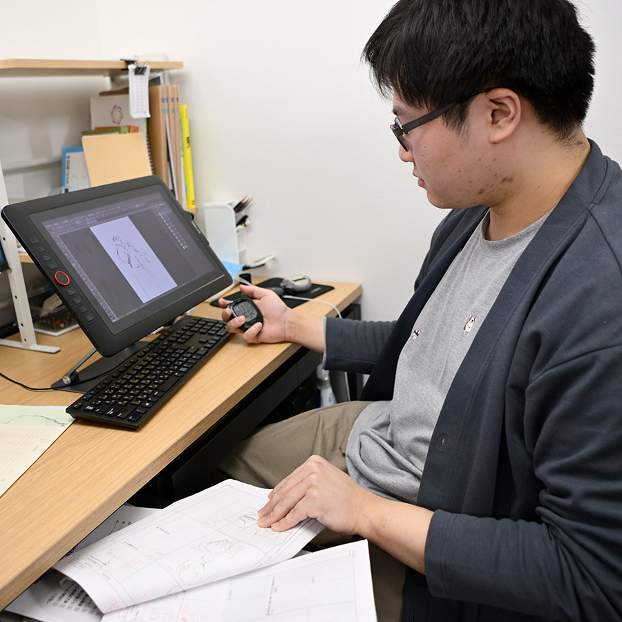 - H.Y.(ア) 最初の半年間は動画研修でした。僕の時は動画スタートだったので、動画のやり方やトレス方法を教わりながら、画力向上のために模写やデッサンの勉強もしていました。研修後は動画マンの仕事をさせてもらって、今はレイアウトと二原作業をしています。なかなか納得のいくものができず、難しさを感じています。