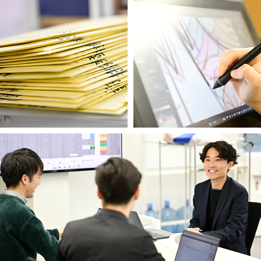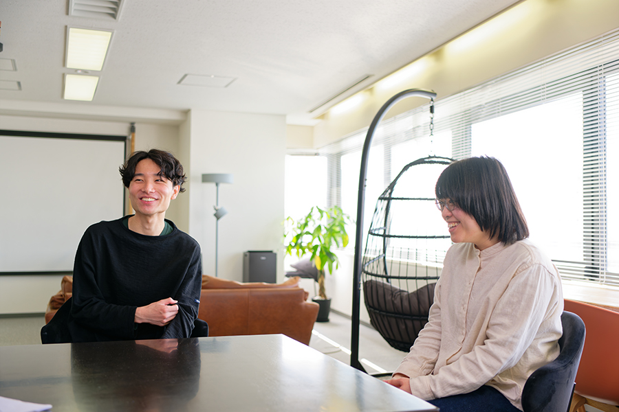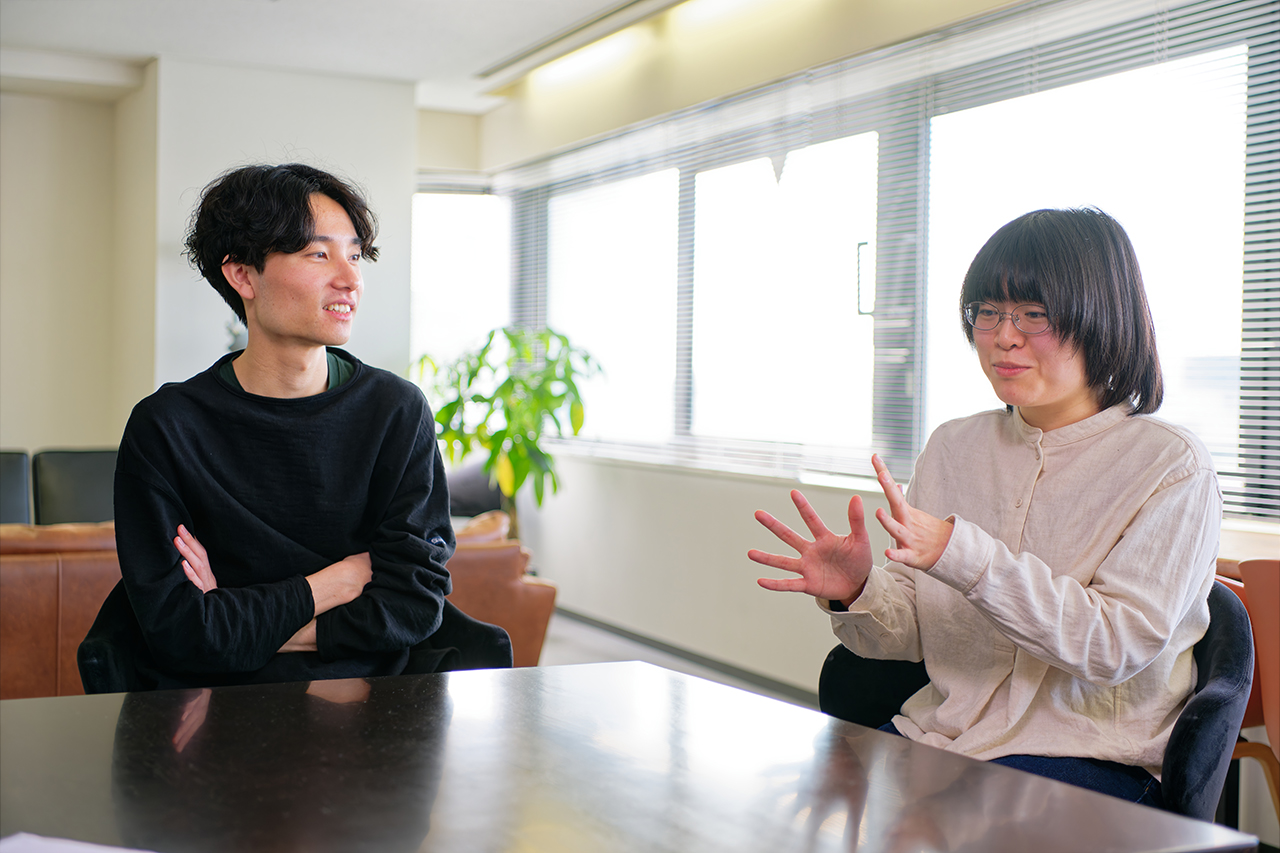 - K.K.(制) たしかに会社説明会の時に従業員数を見て、「少なっ!」とは思いました(笑)。でも、先ほどT.Y.さんが入社理由に『新卒1期生』を挙げたように、僕もそこは魅力だと思っています。『今までこうやってきた』という確立された会社のフォーマットがないため、経験豊富な先輩たちから教えていただいたことをベースに、今も業務をしながら不要なところは削ったり、違う方法を探したりと、やり繰りしていく面白さを感じています。