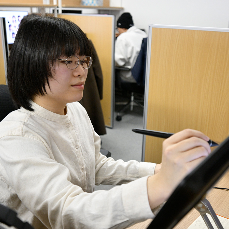 - T.Y.(ア) アニメーターは教育面に力を入れてくれているのをすごく感じます。私は美大出身ですが、アニメの作り方を知らない状態で入社しました。仕事ではデジタルで描いていますが、入社まではずっと紙に描いてきたのでフォルダの整理などパソコン関係が本当に分からなくて……。ただ、研修期間の3カ月間でパソコンの使い方も懇切丁寧に教えていただけて、今はある程度はバッチリです。あと、OUTLINEの先輩が2週に一度、絵の描き方講座を開いてくださっていて、そこでも勉強しています。今はいろいろな作品の動画をやっていますが、もともとオリジナル作品が好きなので今後携わるのが楽しみです。