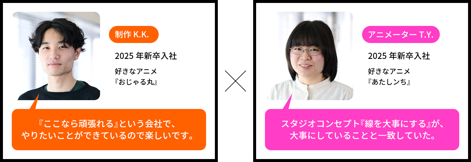 - K.K.(制作) もともとハードな業界だと想像していたので、自分の想像よりはハードではないです。僕はもともと『ここなら頑張れる』という会社だけを受けているし、実際にやりたいことを仕事としてできているので楽しいです。趣味もあまりないので、仕事でアニメーターさんの絵を見られてうれしいですね。