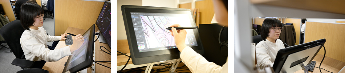 - T.Y.(ア) そうですね。小さい頃から絵を描くことが大好きなので、朝から晩までずっと描いていられるのがすごく楽しいです。でも、ずっと座りっぱなしはちょっと辛いです……。