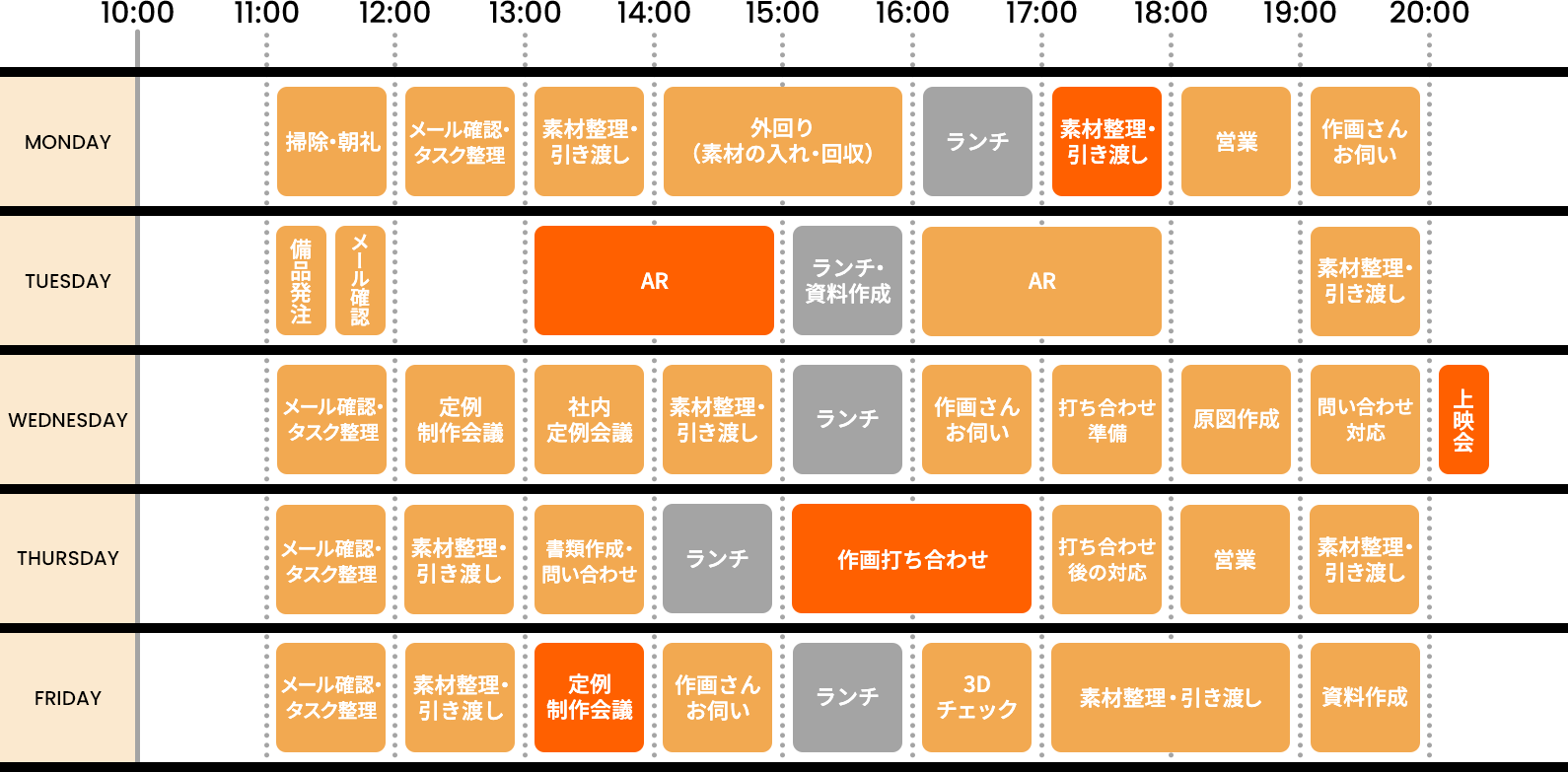 - T.Y.(ア) 年によって変わるかもしれませんが、私たちの代はグループ会社のEOTAスタジオデイジーで3カ月研修を受けて、今は本番での動画をやっています。入社前は「現場は怖いのかな」と思っていましたが、全くそんなことはありませんでした。先輩方や動検さんが優しく教えてくださっているので、すごく楽しいです。